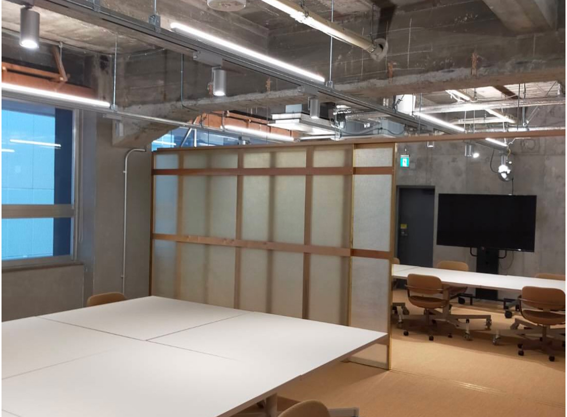 間仕切りが動く部屋を作ることにより、チームの大きさに合わせて部屋の大きさを変えられるデザイン。